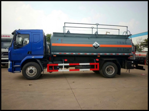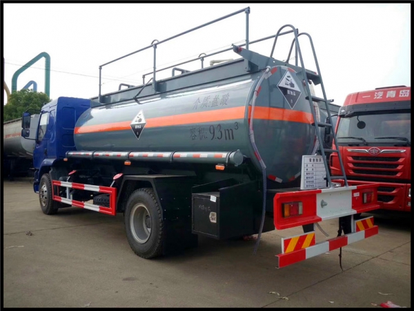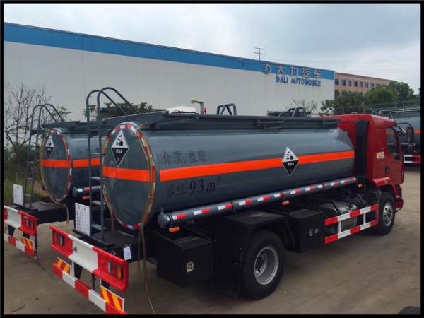 罐體采用碳鋼制作外殼,厚度符合國標GB18564,襯塑后水容積10方左右,罐體截面正圓形,罐體內(nèi)部通過鋼網(wǎng)過度,內(nèi)襯聚乙烯16MM厚,鋼襯塑雙隔板結構,罐頂1個全塑進料口,1個呼吸閥,帶碳鋼折疊護欄,罐頂帶圍邊,圍邊內(nèi)瀝青防腐處理。罐體后尾部底口處1個DN100不銹鋼內(nèi)襯四氟緊急切斷閥帶緊急開關后保險杠控制,通過襯塑三通管道,后尾部左右各1個DN80塑料球閥帶塑料出口。1個工具箱,PVC炮筒管2根,滅火器2只。罐體后尾部爬梯1只。