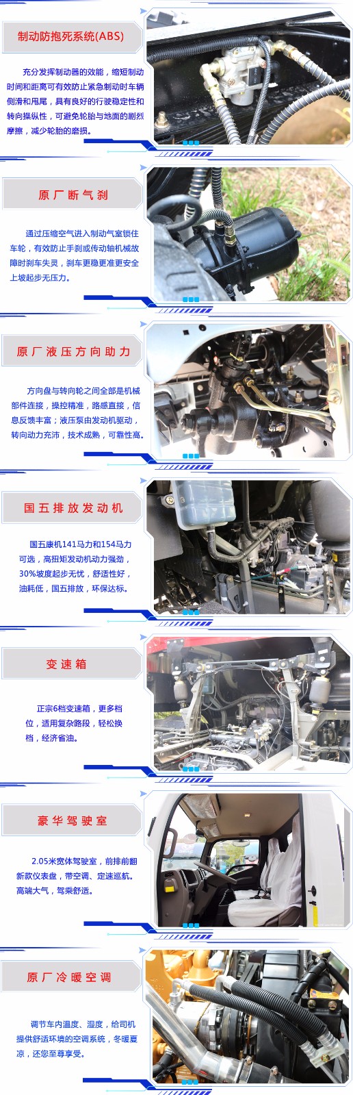 底盤配置:該車才用福田康明斯154馬力發動機(歐五排放標準帶尿素罐),6檔手動變速箱,3800mm軸距,7.50R16鋼絲胎,氣剎,帶冷熱空調,帶離合器助力,帶方向助力,帶定速巡航功能,2.05米寬體駕駛室??傎|量:7噸,車身自重4.8噸。