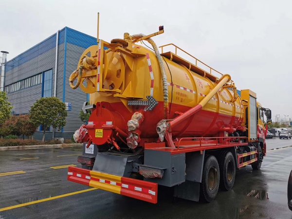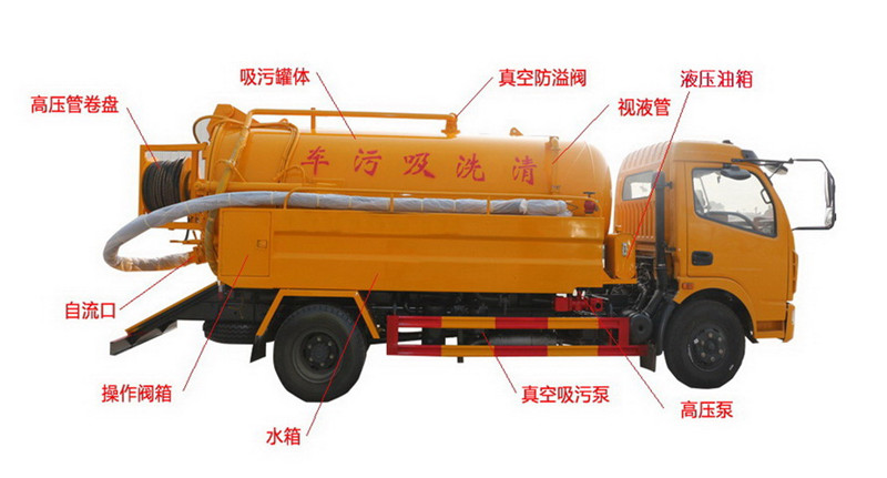 真空吸污部分:專用部分由取力器、傳動軸、真空吸污泵、水氣分離器、油氣分離器、多路換向閥、罐體、抽污閥、放污閥、防溢閥、視污管、真空壓力表、管網系統、液壓系統等組成。垂直吸程≥8米,抽滿罐時間﹤6min,排滿罐時間﹤5min,真空度高、吸程遠、壓力大,罐體可液壓舉升,后蓋可液壓開啟,標配8米長吸污管(內經100mm鋼絲管),可滿足用戶在不同的使用環境中使用。